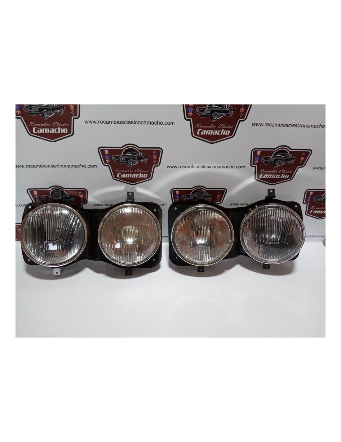 CONJUNTO DE FAROS COMPLETOS DELANTEROS CON SOPORTES SEAT 132 . HALOGENOS MARCA KINBY .