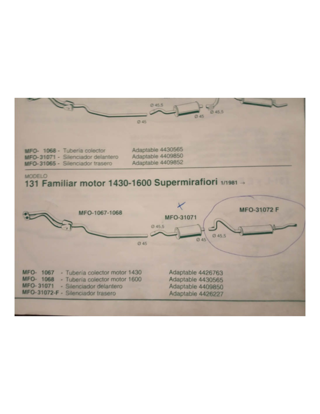 SILENCIOSO TRASERO DE ESCAPE SEAT 131 FAMILIAR MOTOR 1430 Y 1600 SUPERMIRAFIORI DEL 81 EN ADELANTE. FONOS MFO-31072 F 1072 F. REFERENCIA ORIGEN 4426227 .